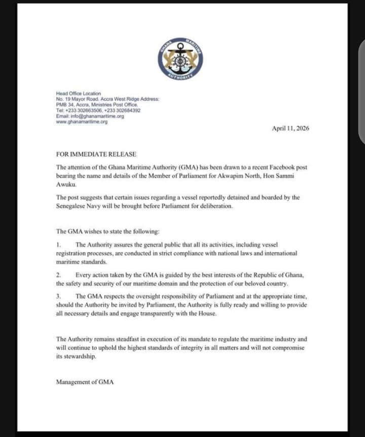 The Authority responded to a Facebook post attributed to Member of Parliament for Akwapim North, Sammi Awuku, which referenced the incident. In a statement released today, the Ghana Maritime Authority emphasized that all operations, including vessel registration, adhere strictly to national legislation and international maritime regulations.